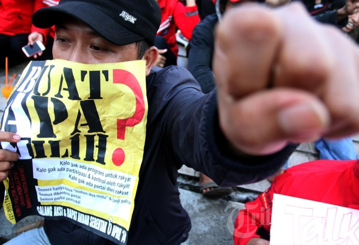 Gabungan buruh dari berbagai serikat pekerja/karyawan, berdemo menolak Pemilu 2014 di Bundaran Hotel Indonesia, Jalan MH Thamrin, Jakarta Pusat. Minggu (6/4/2014). Mereka mengganggap calon presiden 2014 ini tidak banyak memperjuangan nasib kaum pekerja/buruh yang hidup semakin terhimpit. (Warta Kota/Henry Lopulalan)