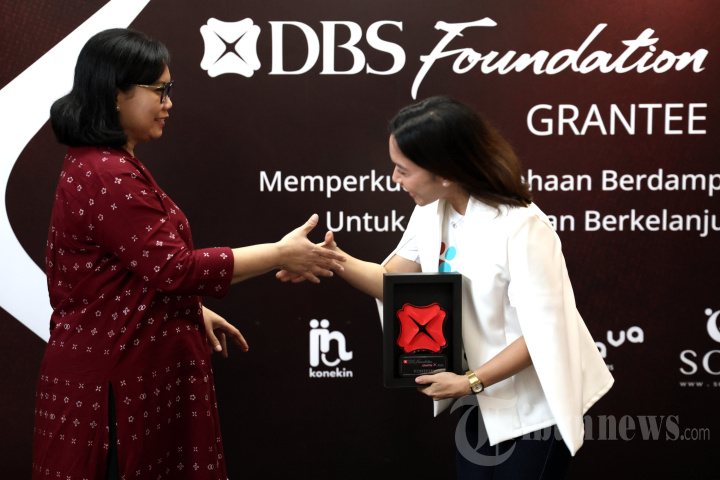 Head of Group Marketing & Communications PT Bank DBS Indonesia Mona Monika (kiri) memberikan plakat kepada CEO KONEKIN Indonesia Marthella Sirait (kanan) saat Grant Program 2025 di Jakarta, Rabu (11/3/2026). DBS Foundation berkomitmen dalam bertumbuh bersama komunitas dan membangun ekosistem yang lebih inklusif melalui DBS Foundation Grant Program 2025. Program ini merupakan inisiatif DBS Foundation dalam mendukung pertumbuhan social enterprises dan businesses for impact yang menghadirkan solusi inovatif bagi berbagai tantangan sosial di Indonesia. Pada tahun ini, DBS Foundation menyalurkan dana hibah sebesar SGD 850.000 atau sekitar Rp11,2 miliar kepada lima businesses for impact di Indonesia. Dukungan tersebut diproyeksikan dapat menjangkau lebih dari 1,9 juta penerima manfaat. TRIBUNNEWS/IRWAN RISMAWAN