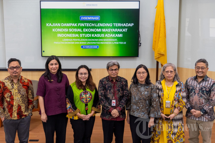 Deputi Direktur Pengawasan Usaha Pembiayaan Berbasis Teknologi Otoritas Jasa Keuangan (OJK) Anjar Sumarjati (tengah) bersama Direktur Eksekutif Asosiasi Fintech Pendanaan Bersama Indonesia (AFPI) Yasmine Meylia Sembiring (kedua kiri), Direktur Keuangan PT Pembiayaan Digital Indonesia (AdaKami) Valentina Juveline (ketiga kiri), Kepala Kajian Transformasi Digital dan Studi Perilaku Lembaga Penyelidikan Ekonomi dan Masyarakat Fakultas Ekonomi dan Bisnis Universitas Indonesia (LPEM FEB UI) Prani Sastiono (ketiga kanan), Direktur Kelompok Spesialis Riset dan Widyaiswara OJK Institute Ida Rumondang H. Sipahutar (kedua kanan), Kepala LPEM FEB UI Chaikal Nuryakin (kanan) dan Akademisi dan Praktisi Sektor Keuangan Ibrahim Kholilul Rohman (kiri) berbincang disela-sela konferensi pers Diseminasi Kajian Dampak Fintech Lending Terhadap Kondisi Sosial Ekonomi Masyarakat: Studi Kasus AdaKami di Jakarta, Rabu (25/2/2026). Riset terbaru LPEM FEB UI mengestimasikan bahwa pada tahun 2024, AdaKami berkontribusi terhadap Produk Domestik Bruto (PDB) Indonesia dengan kisaran nilai sebesar Rp6,95 triliun hingga Rp10,96 triliun. Besaran kontribusi tersebut setara dengan PDB negara kepulauan seperti Tonga, yang pada 2024 tercatat sebesar USD 558 juta atau sekitar Rp 9,38 triliun dengan kurs saat ini, dan hasil riset LPEM FEB UI menunjukkan bahwa penyaluran pinjaman AdaKami berperan sebagai bantalan keuangan (financial buffer) yang membantu rumah tangga memenuhi kebutuhan, terutama dalam situasi mendesak, sehingga mampu menjaga tingkat konsumsi (consumption smoothing). TRIBUNNEWS/IRWAN RISMAWAN