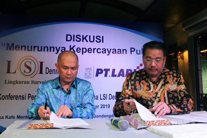 Pendiri Lingkaran Survei Indonesia (LSI) Denny JA (kanan) bersama Pimpinan Proyek PT LAPI ITB Donald C Lantu (kiri) saat melakukan penandatanganan perjanjian kerjasama disela-sela acara diskusi yang mengangkat tema Menurunnya Kepercayaan Publik di kawasan Menteng, Jakarta Pusat, Rabu (13/11/2019). Diskusi tersebut membahas efek pilpres 2019, menurunnya kepercayaan terhadap institusi negara dan lembaga sosial. Disela acara tersebut LSI Denny JA juga menjalin kerjasama dengan PT Lapi ITB tentang program bersama mini MBA & Short Course bidang Good Governance dan Political Marketing. Tribunnews/Jeprima