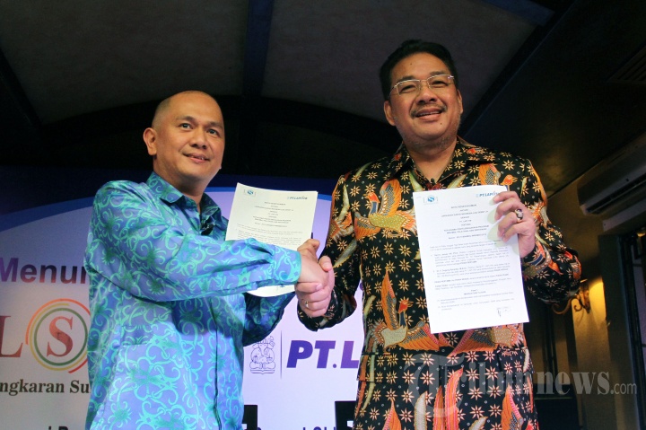 Pendiri Lingkaran Survei Indonesia (LSI) Denny JA (kanan) bersama Pimpinan Proyek PT LAPI ITB Donald C Lantu (kiri) saat berfoto bersama usai penandatanganan perjanjian kerjasama disela-sela acara diskusi yang mengangkat tema Menurunnya Kepercayaan Publik di kawasan Menteng, Jakarta Pusat, Rabu (13/11/2019). Diskusi tersebut membahas efek pilpres 2019, menurunnya kepercayaan terhadap institusi negara dan lembaga sosial. Disela acara tersebut LSI Denny JA juga menjalin kerjasama dengan PT Lapi ITB tentang program bersama mini MBA & Short Course bidang Good Governance dan Political Marketing. Tribunnews/Jeprima