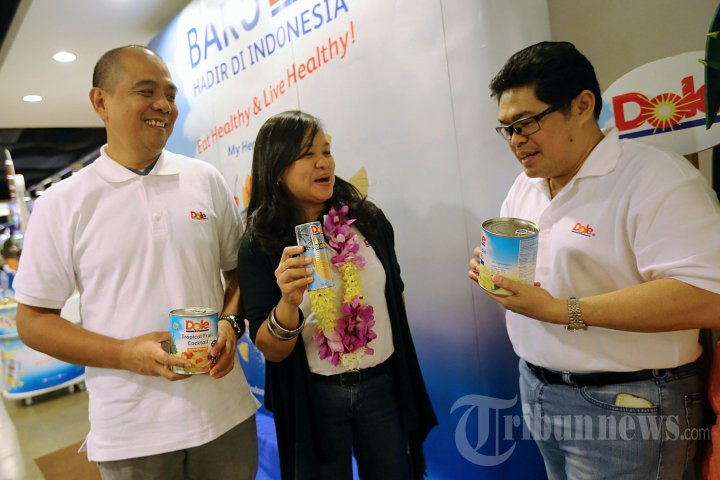 Dari kiri ke kanan, Asean Director Commercial Bussines Group Dole Asia, Noel Casanova, Corporate Accounts Development Manager Packaged Food Divison, Giovanna Talag, dan Country Director Commercial, Syarifuddin Saide berbincang sambil menunjukkan produk kemasan buah dalam kaleng Dole di Mal Taman Anggrek, Jakarta Barat, Sabtu (14/12/2013). Dole yang berasal dari Hawai, secara resmi memasuki pasar Indonesia dengan 3 jenis kemasan buah-buahan guna menjawab kebutuhan konsumen Indonesia untuk makan dan hidup sehat. (TRIBUNNEWS/DANY PERMANA)