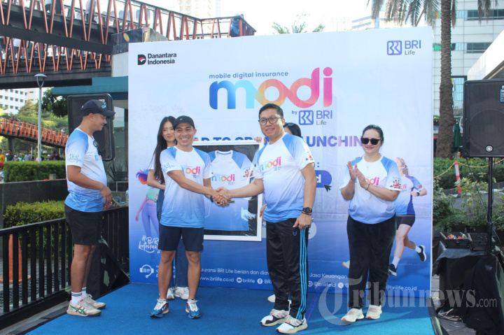 GAYA HIDUP SEHAT - Prosesi penandatanganan MOU antara BRI Life dengan Gofit di sela-sela kegiatan Modi Fun Run 7k yang digelar saat Car Free Day di sepanjang Jalan Sudirman-Setiabudi, Jakarta Selatan, Minggu (12/4/2026). Kolaborasi ini berfokus pada edukasi gaya hidup aktif, sekaligus pengenalan zsolusi perlindungan Modi yang relevan bagi komunitas olahraga dan kebugaran. TRIBUNNEWS/HO