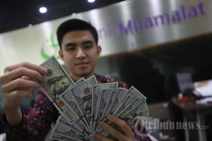 NILAI TUKAR RUPIAH - Petugas menunjukkan mata uang dollar di Kantor Cabang Muamalat Tower, Jakarta, Kamis (5/3/2026). nilai tukar Rupiah melemah terhadap Dolar AS. Data Bloomberg menunjukkan Rupiah di pasar spot terdepresiasi 0,08% menjadi Rp 16.905 per dolar AS, meskipun kurs referensi Jisdor BI justru menunjukkan penguatan tipis ke Rp 16.886 per dolar AS. Menurut analis, pelemahan Rupiah dipicu oleh ketegangan geopolitik di Timur Tengah, termasuk insiden kapal selam AS dan serangan terhadap kapal tanker minyak. Tribunnews/Jeprima