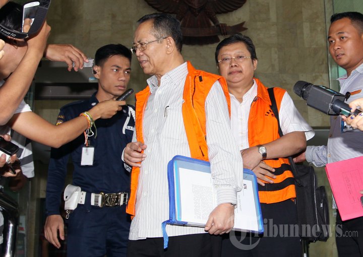 Mantan Walikota Bandung Dada Rosada bersama mantan Sekda Kota Bandung Edi Siswadi usai menandatangani berkas penyidikan yang lengkap untuk kemudian maju ke proses pengadilan, di Gedung Komisi Pemberantasan Korupsi, Jakarta, Kamis (12/12/2013). Dada bersama Edi diduga terlibat dalam kasus pemberian hadian kepada Hakim Tipikor Bandung terkait pengurusan dana bantuan sosial di Pemkot Bandung. (TRIBUNNEWS/DANY PERMANA)