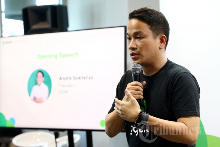 Presiden Gojek Group Andre Soelistyo memberikan paparan dalam peluncuran program Gojek Xcelerate di Jakarta (10/9/2019). Gojek Xcelerate merupakan sebuah program akselerator kolaborasi antara Gojek bersama Digitaraya, didukung oleh pemain industri kelas dunia lainnya, yang ditujukan untuk mencetak lebih banyak unicorn merah putih yang menjadikan Indonesia digital power house di Asia Tenggara. Tidak hanya itu, melalui pengembangan startup dalam program ini juga ditujukan untuk mengembangkan startup merah putih sehingga mampu bertumbuh secara pesat dan menciptakan dampak sosial positif yang lebih luas. Tribunnews/Irwan Rismawan