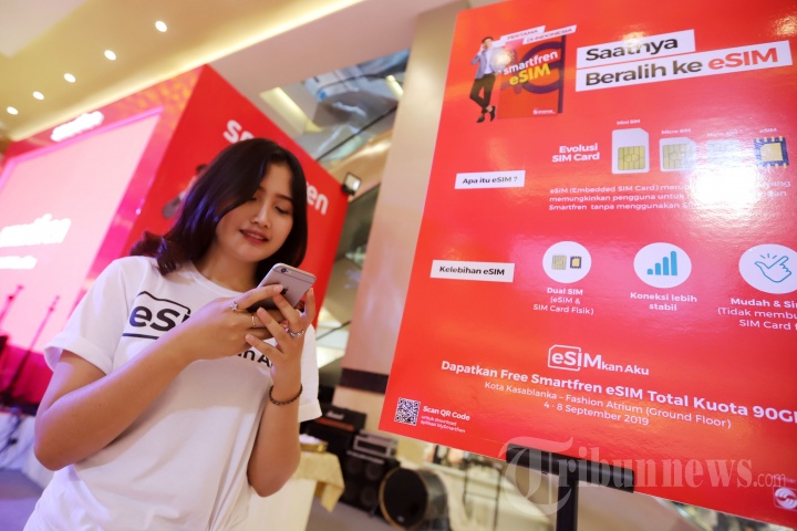 Seorang SPG saat mencoba menggunakan eSim Smartfren di acara eSIMkan aku di Kota Kasablanka, Jakarta Selatan, Jumat (6/9/2019). Program eSIMkan aku Smartfren menghadirkan program upgrade eSim gratis bagi para pelangannya, selain itu bagi pelanggan baru dan yang belum memiliki iPhone dengan fasilitas eSim tersedia program trade in dengan cashback hingga 3,4 juta rupiah, serta eSim gratis dengan kuota internet 4G 90gb berlaku selama setahun penuh. Tribunnews/Jeprima