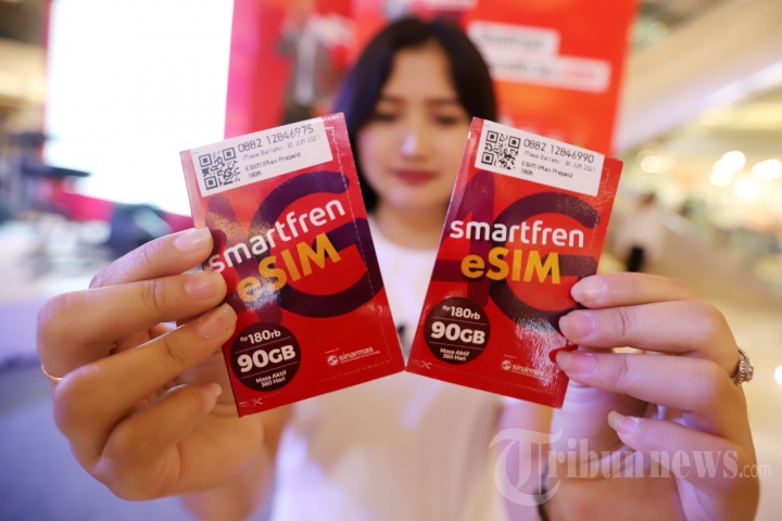 Sales Promotion Girl (SPG) saat menunjukkan eSim Smartfren di acara eSIMkan aku di Kota Kasablanka, Jakarta Selatan, Jumat (6/9/2019). Program eSIMkan aku Smartfren menghadirkan program upgrade eSim gratis bagi para pelangannya, selain itu bagi pelanggan baru dan yang belum memiliki iPhone dengan fasilitas eSim tersedia program trade in dengan cashback hingga 3,4 juta rupiah, serta eSim gratis dengan kuota internet 4G 90gb berlaku selama setahun penuh. Tribunnews/Jeprima