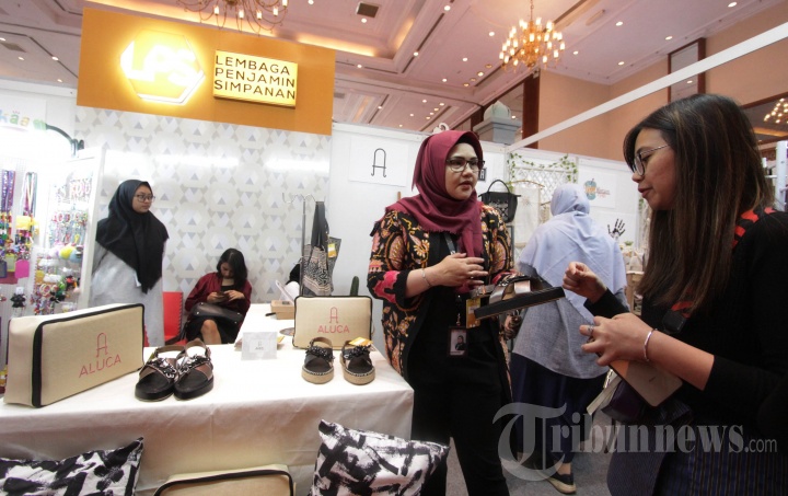 Direktur Group Manajemen Risiko Lembaga Penjamin Simpanan (LPS) Dewi Gayatri berbincang dengan pelaku UKM saat meninjau stan UKM Mitra Binaan LPS pada pameran Indocraft 2019 di Jakarta, Kamis (31/10/2019). Sebagai wujud pemberdayaan ekonomi masyarakat, LPS menggelar kegiatan sosial Program Mitra Binaan LPS yang dilaksanakan mulai Oktober hingga Desember 2019 dalam bentuk pemberian pelatihan hingga penyediaan akses pameran bagi para UKM binaan. TRIBUNNEWS/HO