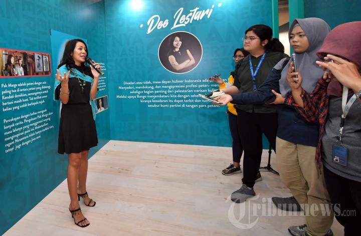 Penulis Dee Lestari (kiri) memberikan keterangan pers mengenai peluncuran 'Program Petani Muda' di Jakarta, Rabu (25/9/2019). Program tersebut diluncurkan untuk mendukung regenerasi petani agar ketersediaan bahan pangan terjamin dan pelestarian #KelezatanAsli kuliner Indonesia dapat terus dilakukan. Dalam kesempatan tersebut juga diluncurkan Bango kemasan khusus Cita Mallika, dengan desain kemasan kisah dan foto empat tokoh petani kedelai hitam Binaan Bango yang merawat kedelai hitam Malika. TRIBUNNEWS/HO