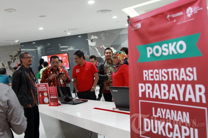 Kepala Dinas Dukcapil Provinsi DKI Jakarta Edison Sianturi (batik merah) berbincang dengan Direktur Sales Telkomsel Sukardi Silalahi (ketiga dari kanan) saat memantau pelayanan registrasi pelanggan prabayar di GraPARI Telkomsel Wisma Alia, Jakarta (26/04). Telkomsel dan Dukcapil berkolaborasi dengan menempatkan petugas pelayanan baik di GraPARI maupun kantor Dukcapil serta menambah jam pelayanan GraPARI dan buka Sabtu Minggu.