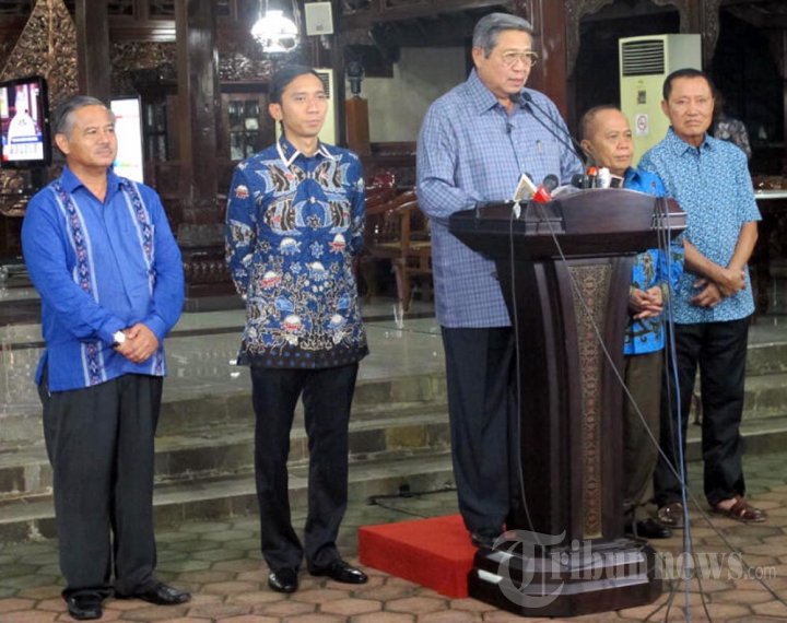 Ketua Umum Ketua Umum PD, Susilo Bambang Yudhoyono (SBY) konfrensi pers menanggapi hasil hitung cepat (quick count) Pemilihan Legislatif 2014 di Kediamannya, Puri Cikeas, Bogor, Jawa Barat, Rabu (9/4/2014). (Tribunnews.com/Srihandriatmo Malau)