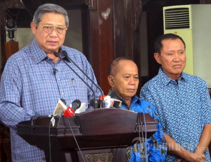 Ketua Umum Ketua Umum PD, Susilo Bambang Yudhoyono (SBY) konfrensi pers menanggapi hasil hitung cepat (quick count) Pemilihan Legislatif 2014 di Kediamannya, Puri Cikeas, Bogor, Jawa Barat, Rabu (9/4/2014). (Tribunnews.com/Srihandriatmo Malau)