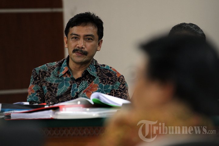 Mantan Menteri Pemuda dan Olah Raga Adhyaksa Dault (kanan) bersaksi dalam sidang Andi Mallarangeng (kiri) di Pengadilan Tindak Pidana Korupsi, Jakarta, Senin (7/4/2014). Andi didakwa terlibat dalam kasus korupsi proyek Hambalang. (TRIBUNNEWS/DANY PERMANA)