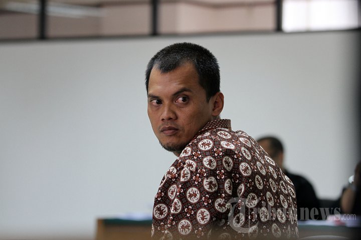 Miko Panji Tirtayasa memberikan kesaksian dalam persidangan mantan Ketua Mahkamah Konstitusi (MK), Akil Mochtar yang digelar di Pengadilan Tindak Pidana Korupsi, Jakarta Selatan, Senin (7/4/2014). Miko dikawal ketat oleh pihak kepolisian menyusul dugaan ancaman keselamatan jiwanya. (TRIBUNNEWS/DANY PERMANA)