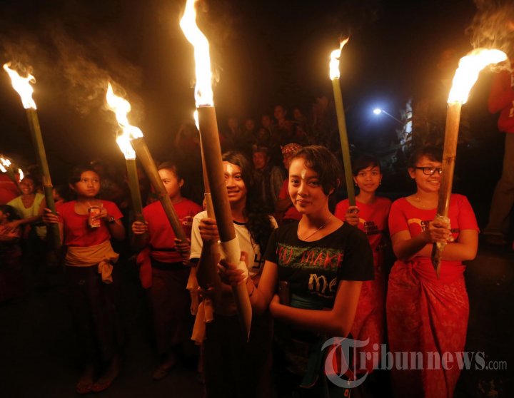 Sejumlah mahasiswi dari Sekaa Teruna Teruni (STT) Mekarjaya, Banjar Nagi, Kecamatan Ubud, Gianyar menyaksikan acara tradisi perang api di Gianyar, Bali (30/3/2014). Tradisi tersebut digelar pada malam Hari Raya Nyepi Tahun Saka 1936 sebagai bentuk perayaan dan untuk mempererat rasa persaudaraan. (TRIBUN BALI/I Nyoman Mahayasa)