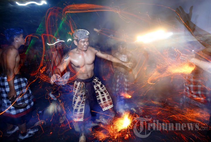 Sejumlah pemuda dari Sekaa Teruna Teruni (STT) Mekarjaya, Banjar Nagi, Kecamatan Ubud, Gianyar saling melempar bara api dari sabut kelapa dalam tradisi perang api di Gianyar, Bali (30/3/2014). Tradisi tersebut digelar pada malam Hari Raya Nyepi Tahun Saka 1936 sebagai bentuk perayaan dan untuk mempererat rasa persaudaraan. (TRIBUN BALI/I Nyoman Mahayasa)