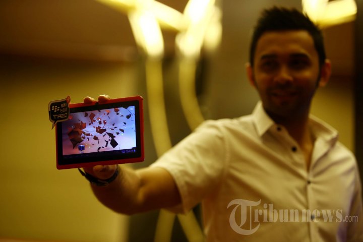 Teuku Zaki menunjukan Tablet Android terbaru keluaran TREQ saat launcing produk di Novotel, Mangga Dua, Jakarta Utara, Senin (28/10/2013). TREQ merupakan perangkat Android yang bisa menjalankan aplikasi BBM yang dijual dengan harga mulai Rp 600.000 hingga Rp 1,7 juta. (Warta Kota/Angga Bhagya Nugraha)