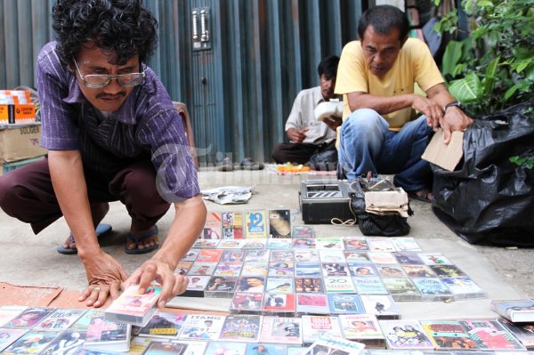 Seorang penjual kaset pita di kawasan pasar Cinde Palembang, Sumatera Selatan, Rabu (6/6/2012). Ia menjual berbagai album kaset pita lagu tembang tempo dulu dari album dangdut penyanyi Rhoma Irama sampai album rock Godbles, duo kribow, SAS dan lain-lain. Sehari ia bisa menjual 10 kaset bahkan bila hari libur ia bisa menjual 50-60 kaset (TRIBUN SUMSEL/M A FAJRI)
