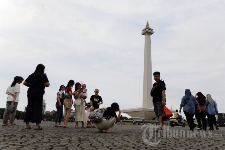 LIBURAN - Warga beraktivitas saat libur Lebaran di Monumen Nasional (Monas), Jakarta, Senin (23/3/2026). Monas yang merupakan Ikon Ibu Kota menjadi salah satu tujuan wisata untuk mengisi libur lebaran. TRIBUNNEWS/IRWAN RISMAWAN