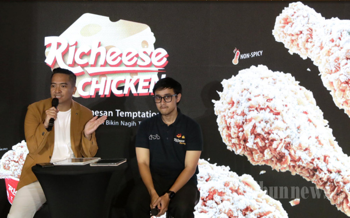 Perwakilan Corporate Communication Richeese Factory Chandrataruna (kiri) bersama Marketing Richeese Factory Daffa (kanan) memberikan penjelasan saat peluncuran menu baru di Jakarta, Sabtu (14/2/2026). PT Richeese Kuliner Indonesia ('RKI'), atau dikenal dengan merek Richeese Factory resmi memperkenalkan inovasi menu terbaru untuk mengawali tahun: Richeese Chicken dengan seasoning Garlic Parmesan. Menariknya, menu ini diperkenalkan dengan nama yang unik: RicheeseGPT yang merupakan singkatan dari Garlic Parmesan Temptation. TRIBUNNEWS/IRWAN RISMAWAN