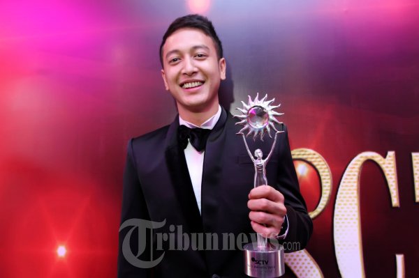 Pemain film, Dimas Anggara meraih penghargaan sebagai Aktor Utama Paling Ngetop pada SCTV Awards 2012 di Teater Tanah Airku, Taman Mini Indonesia Indah, Jakarta Timur, Jumat (30/11/2012) malam. (Tribun Jakarta/Jeprima)