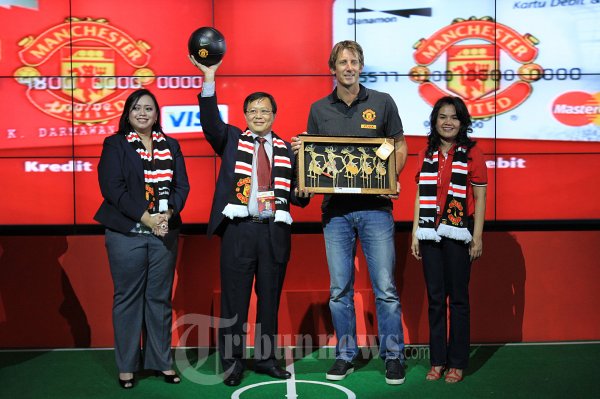 Michellina Triwardhany, Henry Ho, Kiper Legendaris Manchester United Edwin van Der Sar, dan Dessy Masri saat saat berfoto bareng dalam United pengumuman pemenang Red Match Kartu danamon manchester di Resto and Bar Prive Fx Mall, Jakarta Selatan, Senin (18/06/2012). Program red Match kartu danamon memberikan kesempatan kepada 48 nasabah kartu kredit dan kartu debit untuk dapat menyaksikan langsung pertandingan manchester united di old trafford setiap tahunnya. (Tribun Jakarta/Jeprima)