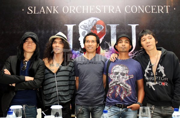 Slank bersama Priam Soesetyo, Direktur MAMLive dan Oleg Sanchabakhtiar saat mengumumkan pemindahan lokasi konser dan jadwal pertunjukannya di Ballroom Hotel Ritz Carlton Pacific Place, Jakarta Selatan, Selasa (07/05/2012). Konser I Slank U yang dimajukan jadwal konsernya menjadi 11 mei 2012. (Tribun Jakarta/Jeprima)