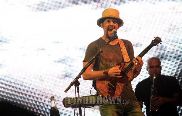 Musisi asal Amerika Serikat Jason Mraz saat menggelar Konsernya yang bertajuk Tour Is a Four Letter Word di Lapangan D Senayan, Jakarta Selatan, Jumat malam (22/06/2012). Jason Mraz mengawali konsernya dengan lagu 'Everything Is Sound'. Seperti biasa, dia tampil simpel dengan topi fedora berbahan jerami, dan t-shirt berwarna hitam dan celana jeans.(Tribun Jakarta/Jeprima)