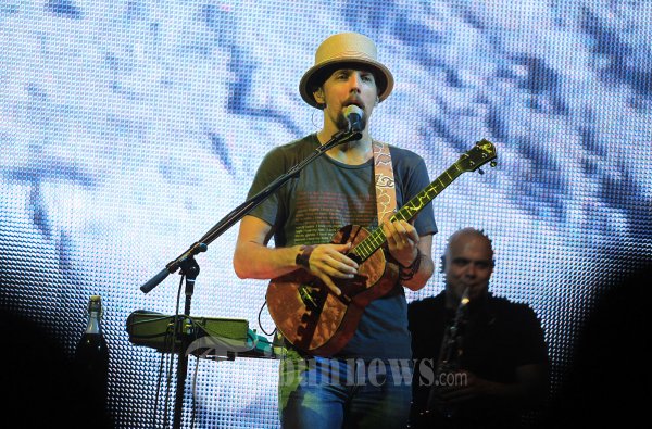 Musisi asal Amerika Serikat Jason Mraz saat menggelar Konsernya yang bertajuk Tour Is a Four Letter Word di Lapangan D Senayan, Jakarta Selatan, Jumat malam (22/06/2012). Jason Mraz mengawali konsernya dengan lagu 'Everything Is Sound'. Seperti biasa, dia tampil simpel dengan topi fedora berbahan jerami, dan t-shirt berwarna hitam dan celana jeans.(Tribun Jakarta/Jeprima)