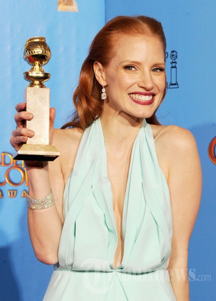 Aktris Jessica Chastain di The 70th Annual Golden Globe Awards yang dihelat di The Beverly Hilton Hotel, Beverly Hills, California, AS, Minggu (13/1/2013) malam waktu setempat. Di ajang bergengsi ini, ia terpilih sebagai aktris terbaik film drama untuk perannya dalam film 'Zero Dark Thirty'. Kevin Winter/Getty Images/AFP