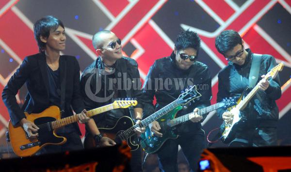 Empat gitaris group band papan atas (KIRI KANAN) Eross Sheila On 7, Cella Kotak, Baim dan Andra, berkolaborasi mainkan interlude lagu Tinggalkan Saja yang dinyanyikan Tantri dalam acara Mega Konser Energi Dari Langit disiarkan langsung dari Srudio 4 RCTI, Kebon Jeruk, Jakarta. Rabu (28/9/2011) Konser KOTAK bertepatan dengan peluncuran album baru Kotak bertajuk Energi Repackage.(TRIBUNNEWS.COM/FX ISMANTO)