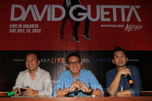Para promotor Danny Budhiarto Operational Director Dyandra & Co,Yudha Perdana Brand Manager Ismaya Live dan Yoga Argantara Director Gamma Live saat melakukan konferensi pers mengenai rencana David Guetta world tour 2012 di Dragon Fly Graha BIP, Kawasan Gatot Subroto, Jakarta Selatan, Rabu (29/8/2012). (Tribun Jakarta/Jeprima)