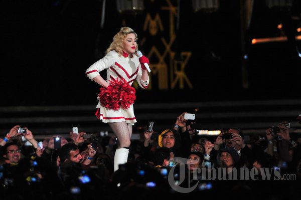 Aksi panggung penyanyi pop asal Amerika, Madonna saat tampil pada konsernya yang digelar di Stadion Nasional, Santiago, Chile, Kamis (20/12/2012). AFP PHOTO / FRANCESCO DEGASPERI