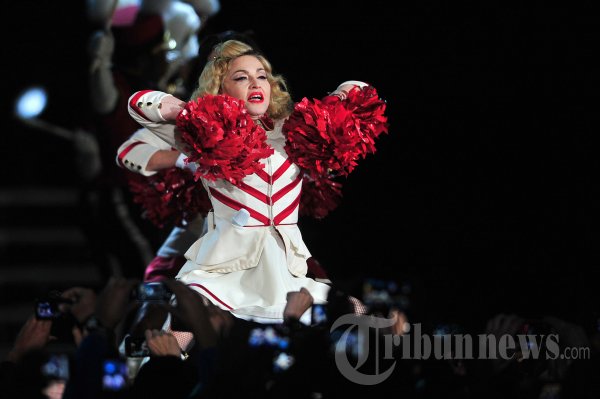 Aksi panggung penyanyi pop asal Amerika, Madonna saat tampil pada konsernya yang digelar di Stadion Nasional, Santiago, Chile, Kamis (20/12/2012). AFP PHOTO / FRANCESCO DEGASPERI