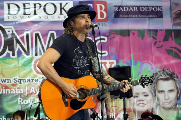 Penyanyi Mike Tramp saat tampil pada acara Charity untuk korban banjir di Depok Town Square, Depok, Jawa Barat, Kamis (24/1/2013). (Tribun Jakarta/Jeprima)