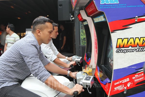 Pemain film Nicholas Schubring Saputra atau biasa dipanggil Nicholas saputra bersama Arianto Wibowo atau lebih dikenal dengan Ari Wibowo saat bermain game motor balap pada acara peluncuran jam Tissot di Kawasan SCBD Sudirman, Jakarta Selatan, Selasa (9/10/2012). (Tribun Jakarta/Jeprima)