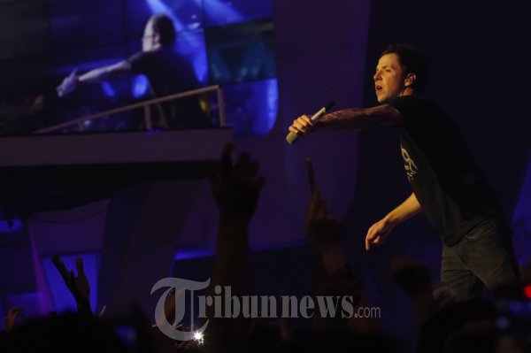 Aksi panggung Grup band asal Kanada Simple Plan dalam perayaan HUT ANTV ke-20, Minggu (17/3/2013) di JCC. Simple Plan beranggotakan Pierre Bouvier, Jeff Stinco, S. (TRIBUN JAKARTA/JEPRIMA)