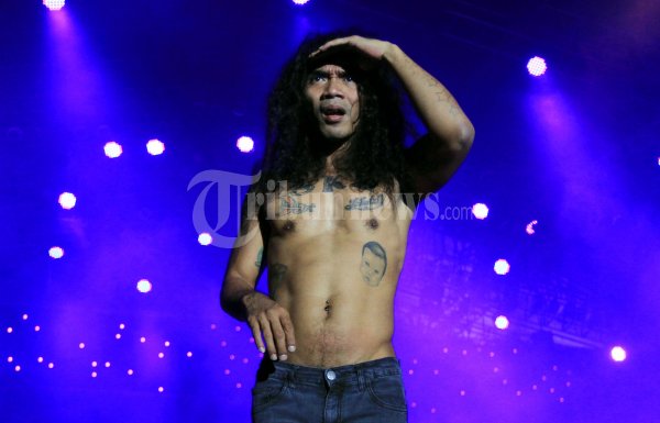 Grup band Slank saat tampil pada rangkaian acara musik Pekan Raya Jakarta fair yang merupakan event tahunan yang di adakan dalam rangka hut jakarta yang ke 485 tahun di pekan Raya Jakarta (PRJ), Jakarta Pusat, Kamis malam (28/06/2012). Kaka Slank yang tampil dengan dada terbuka membuat histeris para Slankers wanita. (Tribun Jakarta/Jeprima)
