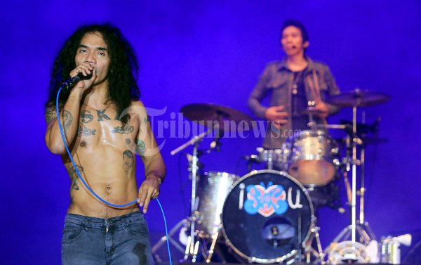 Grup band Slank saat tampil pada rangkaian acara musik Pekan Raya Jakarta fair yang merupakan event tahunan yang di adakan dalam rangka hut jakarta yang ke 485 tahun di pekan Raya Jakarta (PRJ), Jakarta Pusat, Kamis malam (28/06/2012). Kaka Slank yang tampil dengan dada terbuka membuat histeris para Slankers wanita. (Tribun Jakarta/Jeprima)