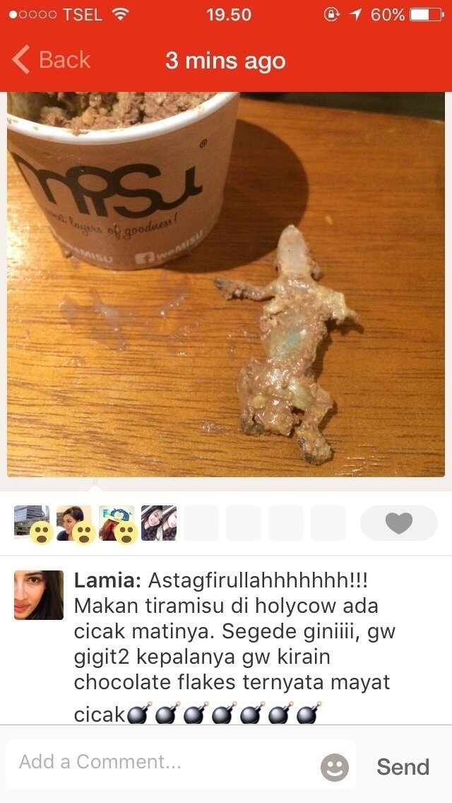 "Astagfirullah!! Makan tiramisu di holycow ada cicak matinya. Segede gini, gw gigit2 kepalanya, gw kirain chocolate flakes ternyata mayat cicak," tulis Lamia melalui akun Path miliknya.